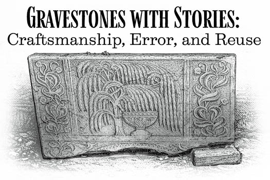 By the mid-18th century, gravestone carving had become more elaborate. Winged skulls, of-ten called death’s heads, symbolized mortality and the soul’s flight to heaven. Later designs featured cherubs or soul effigies, followed by urn-and-willow motifs that reflected changing artistic tastes. Borders grew more refined, let-tering styles evolved, and individual craftsmen developed recognizable styles. Each stone was carved by hand with chisels and mallets, guided by handwritten notes or verbal instructions from grieving families. Even the most skilled carvers sometimes made mistakes. A name might be mis-spelled, a date reversed, or spacing misjudged. Sometimes the stone revealed a hidden flaw only after carving had begun. Because stone cannot be erased or patched, a mistake often meant the gravestone was rejected.