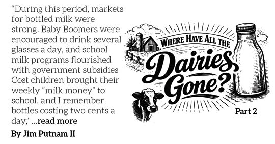 During this period, markets for bottled milk were strong. Baby Boomers were encouraged to drink several glasses a day, and school milk programs flourished with government subsi-dies. Most children brought their weekly “milk money” to school, and I remember bottles cost-ing two cents a day, lat-er five cents. Home de-livery also thrived. Mr. Nutter and his Pioneer Dairy crew were busy supplying households and encouraging local farmers to produce more. Pioneer held the con-tract for Southwick Schools, stocked the dairy cases at Jones Market and Cantell’s Market, and sent delivery trucks throughout town. Wolfe Brothers on Coes Hill Road and Haas Brothers on College Highway both milked cows, bot-tled milk, and operated home delivery routes. Today we might call their work “value-added farming” or “field to table,” though those terms did not yet exist.