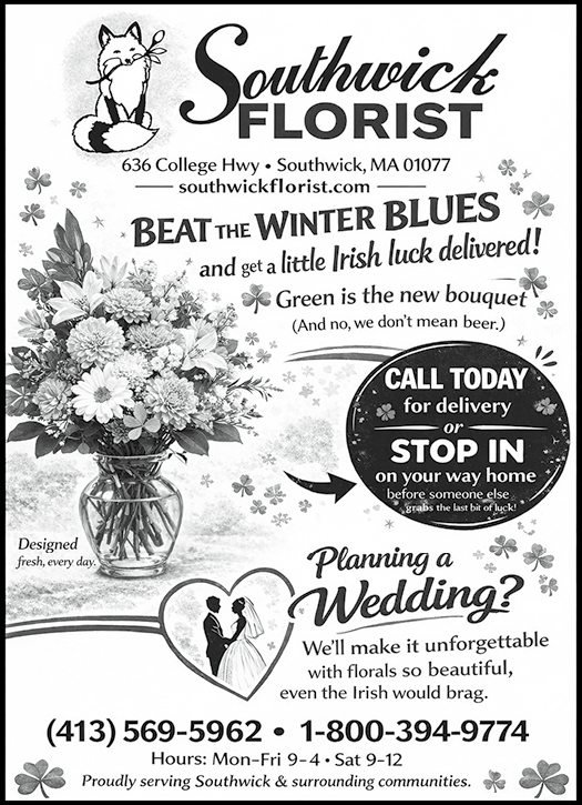 March 14th, 5:00pm - 6:30pm Saint Patrick’s Supper – Our Lady of the Lake, 224 Sheep Pasture Rd, Southwick. The Knights of Columbus, Council #11178 welcomes all to their annual St. Patrick’s Supper. March 14th, 2026 – 5:00 PM to 6:30 PM in the Fr. Shea Hall. Menu: Corned beef cabbage, potatoes, onions, carrots, beverage and dessert. Cost: Ages 13 to adult: $15.00, Ages 5 to 12: $7.00. Under 5: Free. Max Cost/Family = $35.00. Purchase Tix: Call or text 413-569-8440 or email; StPatsTickets@KofC11178.org.