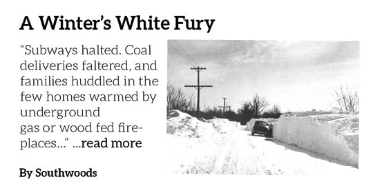 The storm had no howling winds, no scream-ing blizzard voice. The Weather Bureau would not even call it a blizzard. Yet it brought the Northeast to its knees. Buses and automobiles froze in place. Subways halted. Coal deliveries faltered, and families huddled in the few homes warmed by underground gas or wood fed fire-places. In some places, snow piled so high that people dumped it into rivers or down into the city’s warm sewers just to make room for more.