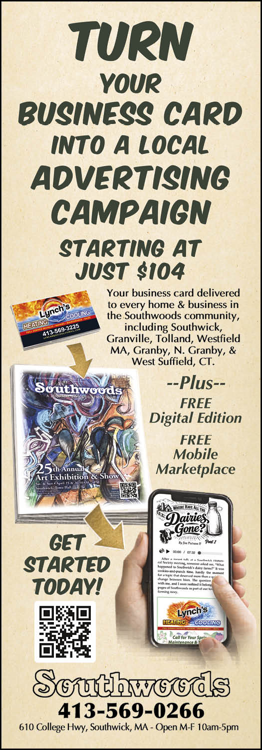 During this period, markets for bottled milk were strong. Baby Boomers were encouraged to drink several glasses a day, and school milk programs flourished with government subsi-dies. Most children brought their weekly “milk money” to school, and I remember bottles cost-ing two cents a day, lat-er five cents. Home de-livery also thrived. Mr. Nutter and his Pioneer Dairy crew were busy supplying households and encouraging local farmers to produce more. Pioneer held the con-tract for Southwick Schools, stocked the dairy cases at Jones Market and Cantell’s Market, and sent delivery trucks throughout town. Wolfe Brothers on Coes Hill Road and Haas Brothers on College Highway both milked cows, bot-tled milk, and operated home delivery routes. Today we might call their work “value-added farming” or “field to table,” though those terms did not yet exist.