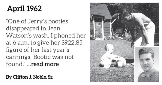 April 9, Monday. One of Jerry’s booties disap-peared in Jean Watson’s wash. I phoned her at 6 a.m. to give her $922.85 figure of her last year’s earnings. Bootie was not found.