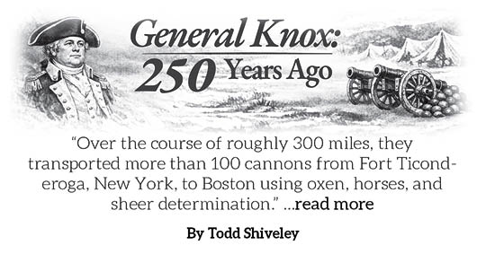 The 250th anniversary of General Henry Knox’s remarkable trek to Boston has brought renewed appreciation for one of New England’s most dramatic contributions to the Revolution-ary War. As the nation prepares to mark the Semiquintennial of American independence this July, our region reflects on the extraordinary journey Knox and his men undertook between late November 1775 and March 17, 1776. Over the course of roughly 300 miles, they transport-ed more than 100 cannons from Fort Ticond-eroga, New York, to Boston using oxen, horses, and sheer determination. Their arrival provided General George Washington with the artillery that ultimately forced the British to withdraw from Massachusetts.
