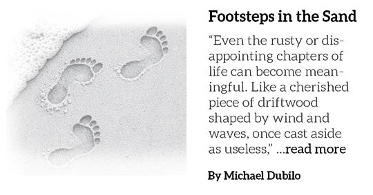 Even in faith the sands can show progress. In the brighter moments, a man saw two sets of footprints but in the harder times, he saw one set and wondered why. His faith told him that in those hard times he was carried by Je-sus. The thought reminded him that even in dif-ficult seasons, people often carry one another through challenges in ways not always visible at the time.