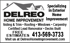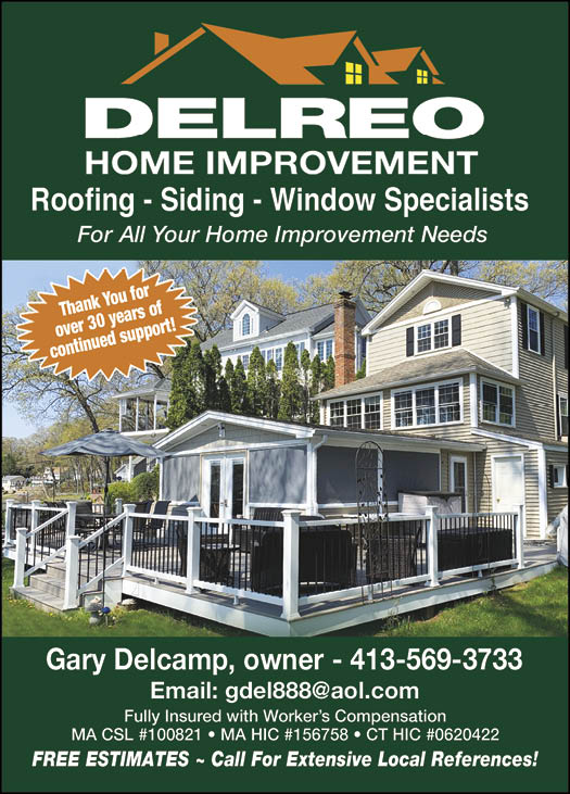 DELREO HOME IMPROVEMENT for all your exterior home improvement needs, ROOFING, SIDING, WINDOWS, DOORS, DECKS & GUTTERS extensive references, fully licensed & insured in MA & CT. Call Gary Delcamp 413-569-3733