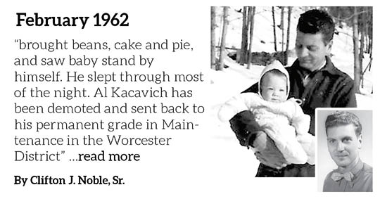 February 5, Monday. This afternoon the Atwaters (E’s folks) brought beans, cake and pie, and saw baby stand by himself. He slept through most of the night. Al Kacavich has been demoted and sent back to his permanent grade in Maintenance in the Worcester District. Bob Crovo is having the upstairs floors sanded in the Dutch Colonial house he bought on Bridge Street, Northampton. His wife is very happy with the place.