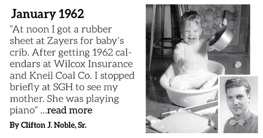 January 3, Wednesday. At noon I got a rub-ber sheet at Zayers for baby’s crib. After getting 1962 calendars at Wilcox Insurance and Kneil Coal Co. I stopped briefly at SGH to see my mother. She was playing piano and asked me to play a few things for her.